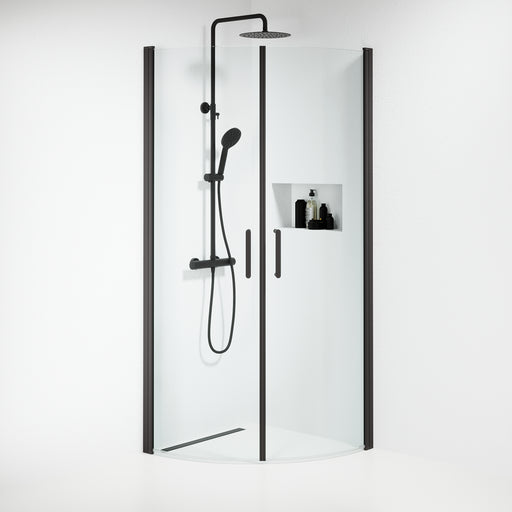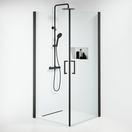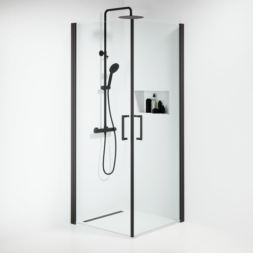Sandefjord Brusehjørne, Dør + Væg, Sort Profil, Klar Glas med Sprosser