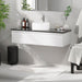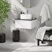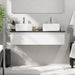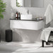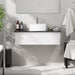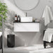 Den dybsorte bordplade i Quartz Stone giver et sofistikeret modspil til den rene, matte hvide farve på skuffer og korpus. Quartz Stone er kendt for sin slidstyrke, modstandsdygtighed over for pletter og nemme vedligeholdelse – en perfekt løsning til et travlt badeværelsesmiljø med krav til både funktion og stil.
