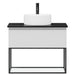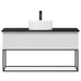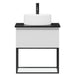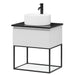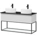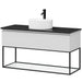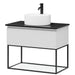 I bunden af skabet findes en åben hylde med glasbund, der tilføjer et let og elegant udtryk. Det fritstående keramiske håndvask fuldender det minimalistiske design og skaber et lyst og harmonisk udtryk i rummet.