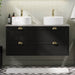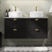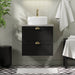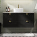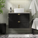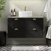 Skabet er udstyret med skuffer, der har en praktisk udskæring til afløbsrøret og sifonen, hvilket gør installationen og vedligeholdelsen enkel og effektiv. Derudover sikrer de klassiske, halvcirkelformede håndtag i messingfarve nem åbning og lukning af skufferne, samtidig med at de bidrager til skabets klassiske udseende.