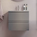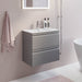 Kongsberg Mat Grå er en stilfuld og pladsbesparende løsning til små badeværelser, med en dybde på kun 36 cm. Denne variant leveres med en elegant hvid håndvask, der skaber en flot kontrast til det grå skab og fremhæver det minimalistiske og tidløse design. Skabet har integrerede greb, som strækker sig langs hele fronten for nem og praktisk åbning.