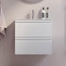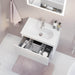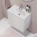 Skufferne er udstyret med en soft close-mekanisme, der sikrer en lydløs og skånsom lukning, hvilket forbedrer både komforten og holdbarheden. Indvendigt tilbyder skabet rigelig opbevaringsplads til badeværelsesartikler samt et dedikeret område til vandrør og vandlås, hvilket gør installationen enkel og hurtig.