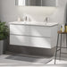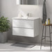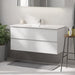Et elegant badeværelsesskab med håndvask i moderne design, perfekt til ethvert badeværelse. Skabet har en mat hvid finish, der tilføjer et friskt og rent look til dit rum. Den indeholder praktiske håndtag for nem åbning og lukning, diskret integreret langs hele skabets front. Dette designelement sikrer et minimalistisk udseende, fri for unødvendige forstyrrelser.