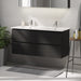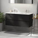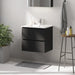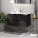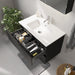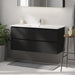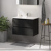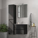 Et elegant badeværelsesskab med håndvask i moderne design, perfekt til ethvert badeværelse. Skabet har en mat sort finish, der tilføjer et friskt og rent look til dit rum. Den indeholder praktiske håndtag for nem åbning og lukning, diskret integreret langs hele skabets front. Dette designelement sikrer et minimalistisk udseende, fri for unødvendige forstyrrelser.
