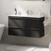 Materialer: Skabet er fremstillet af MDF med en mat sort finish og en hvid håndvask. PU (polyurethan) lakken er yderst modstandsdygtig over for ridser, kemikalier og fugt, og er kendt for sin holdbarhed og styrke.