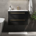 Materialer: Skabet er fremstillet af MDF med en mat sort finish og en hvid håndvask. PU (polyurethan)-lakken er yderst modstandsdygtig over for ridser, kemikalier og fugt og er kendt for sin holdbarhed og styrke.