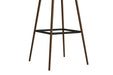 Det mørkegrå stofbetræk passer godt til metalbenene med træfinish, der giver stolen et elegant look, og passer til enhver indretning.